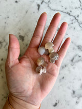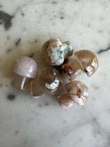 Flower Agate contains opaque Chalcedony inclusions that resemble tiny floral formations. It is also known as Cherry blossom agate. This stone resonates with the Root and Heart Chakra, working to stimulate both energy centers, allowing one to feel grounded and secure in giving and receiving love.