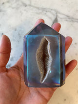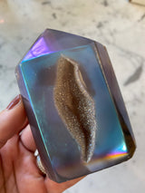 This is an Agate with exposed druzy that has been coated with finely powdered platinum, silver and other trace minerals. The result is a beautiful iridescent, silvery coating.