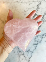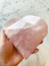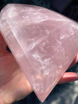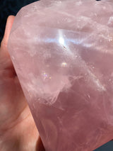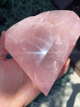 This is a super special piece due to the intricate carving of the facets and the high quality of the Rose Quartz. You will find beautiful rainbows when sunlight shines upon it. It's hard not to fall under this minerals soothing spell.