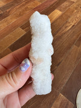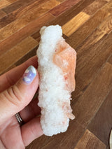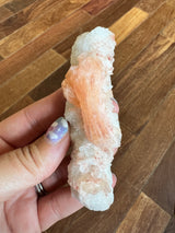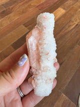 Stilbite is a part of the Zeolite family, found in India. Stalactites are formed on the ceilings of caves and hot springs. These unique pieces are a Quartz stalactite with ribbons of peach Stilbite. The Quartz makes this stunner shine in the sun and its completely covered in Quartz. I love this unique shape and stone combination.