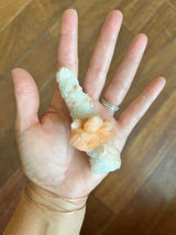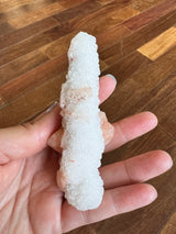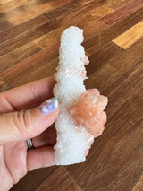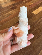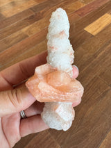 Stilbite is a part of the Zeolite family, found in India. Stalactites are formed on the ceilings of caves and hot springs. These unique pieces are a Quartz stalactite with ribbons of peach Stilbite. The Quartz makes this stunner shine in the sun and its completely covered in Quartz. I love this unique shape and stone combination.