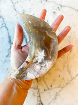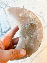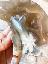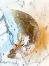 A beautiful Flower Agate moon with a large white Chalcedony flower and also a unique botryoidal formation.