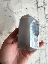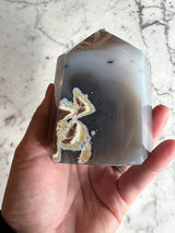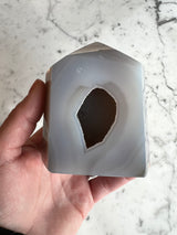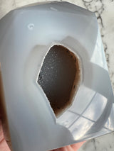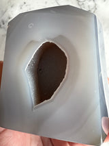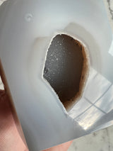 This is an Agate with exposed druzy coated with finely powdered platinum, silver, and other trace minerals. The result is a beautiful iridescent, silvery coating.