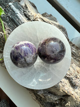 This beautiful variety of Moroccan Amethyst has a chevron appearance, with a deeply saturated purple hue. These are natural specimens, color and banding may differ slightly from the picture. A sphere will be intuitively chosen for you.