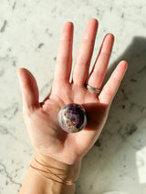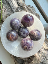 This beautiful variety of Moroccan Amethyst has a chevron appearance, with a deeply saturated purple hue. These are natural specimens, color and banding may differ slightly from the picture. A sphere will be intuitively chosen for you.