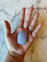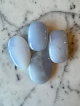 Soothing light blue colored stones. As a Quartz base stone, Blue Chalcedony magnifies and amplifies the inherent stones properties. This stone energizes the throat chakra, allowing one to impart ones guidance and knowledge easefully. It is a great stone for those working in therapy or counseling.