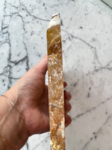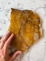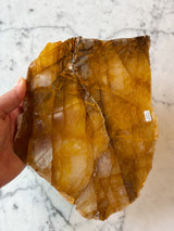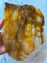 Golden healer is a trade name for Yellow Hematoid Quartz. The yellow veining and coloring are a result of iron staining.