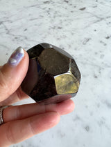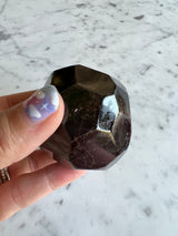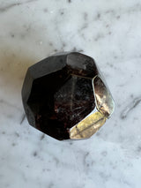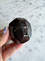 This is an Almandine Garnet from India. This stone has an ancient connection to the earth, at a time when humans were more closely grounded to the earth. In our modern times this same connection can be fostered with this energetic talisman. Due to its bond with the earth it also helps to garner psychic protection, keeping the body firmly rooted and protected.