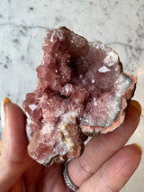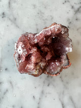 A raw Geode on the outside with deep, saturated pink Amethyst crystals on the inside. When Amethyst forms with Hematite, it results in this pink-colored crystal.