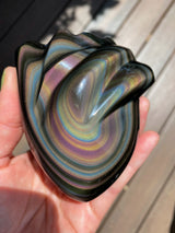This stone is a volcanic glass. The colors seen in Rainbow Obsidian are due to the different layer of molten lava.