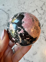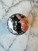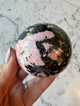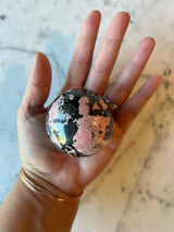 Rhodonite derives from the Greek word rose-red. This batch of palm stones is bubble gum pink with black inclusions of manganese oxide.
