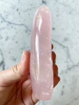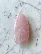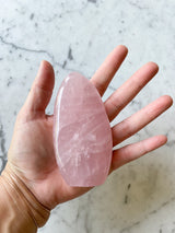 This is self standing free form piece with a flat bottom. It has pretty shimmer and beautiful pink color.