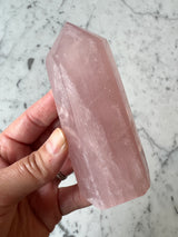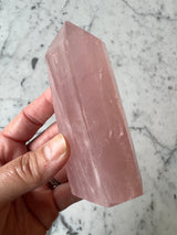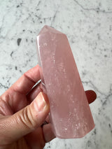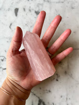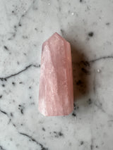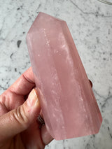 Rose Quartz is one of my top five crystals to own. Everyone should have a Rose Quartz for its gentle and loving energy. This is a polished crystal carved into a tower. The energy of this crystal is concentrated at the point.