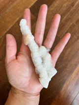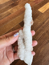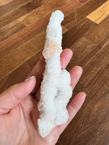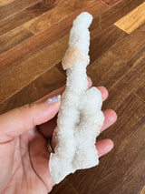 Stilbite is a part of the Zeolite family, found in India. Stalactites are formed on the ceilings of caves and hot springs. These unique pieces are a Quartz stalactite with ribbons of peach Stilbite. The Quartz makes this stunner shine in the sun and its completely covered in Quartz. I love this unique shape and stone combination.