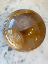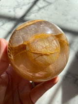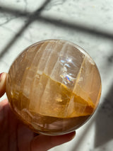 This is part of a beautiful batch of spheres, some which contain rainbows. The trace amount of Hematite gives this quartz a golden/yellow coloring.
