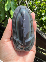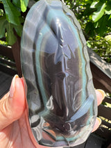 Beautiful, and unique Divine Mother freeform sourced and carved by the miner in Mexico. This artisan's skillful carvings enhance the natural coloration and variety of banding found in this stone. He sees the potential in each piece and carves his vision, bringing beautiful shapes to life. These carvings have a flat base for ease of display.