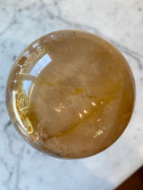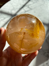 This is part of a beautiful batch of spheres, some which contain rainbows. The trace amount of Hematite gives this quartz a golden/yellow coloring.