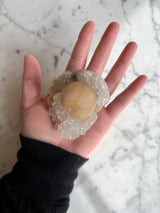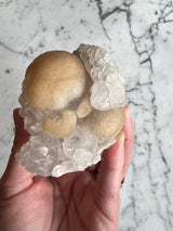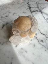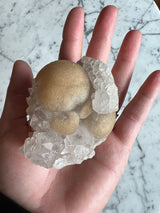 This rare form of Fluorite is only sourced from one place in the world, India. This is a unique botryoidal formation that resemble a fried egg, represented by the yellow Fluorite. Botryoidal means having or reminiscent of grapes.