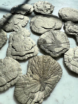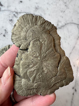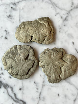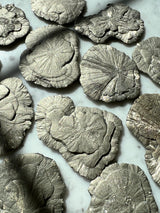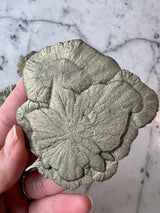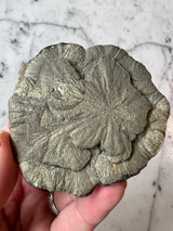 These are unique forms of Pyrite that originate from Illinois. Normally, Pyrite is formed into cubes but when weighted down by sediment it grows laterally and spreads out into circular concretions. The same sparkly, golden surface remains just in a different form.