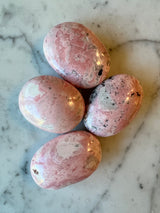 Rhodonite derives from the Greek word rose-red. This batch of palm stones is bubble gum pink with black inclusions of manganese oxide.